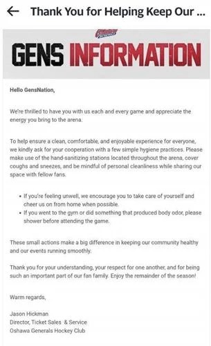 Oshawa’s director of ticket sales and service told local media that the unusual request was prompted by “countless complaints” from attendees who described smells ranging from bad breath to more pungent odors.